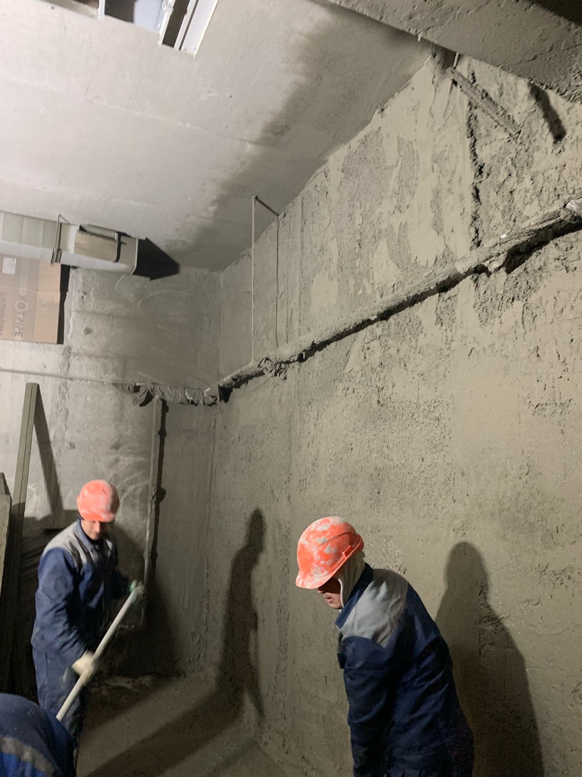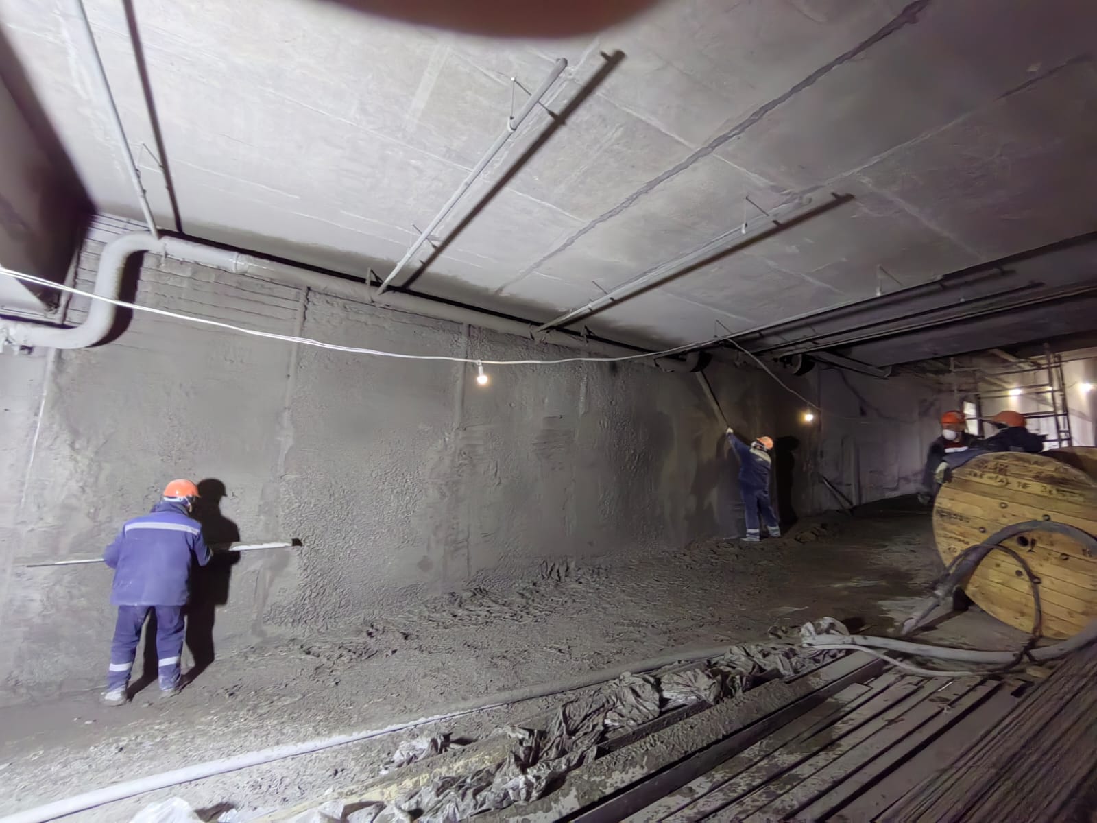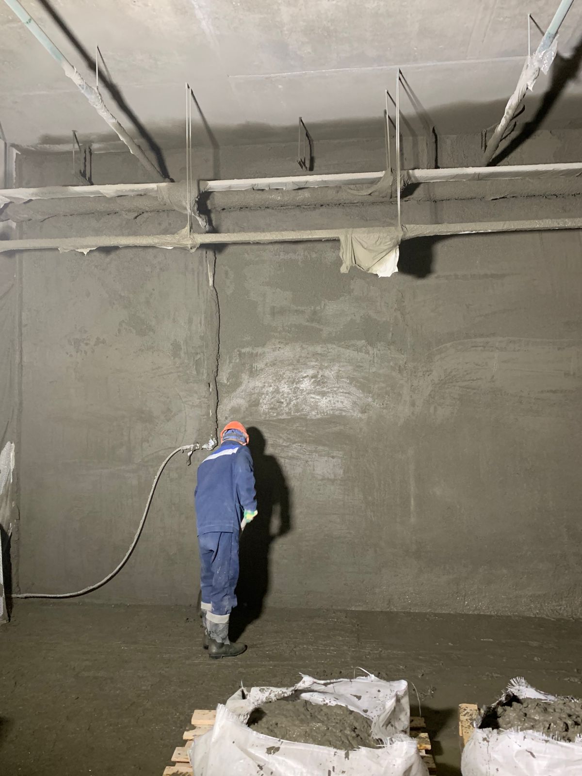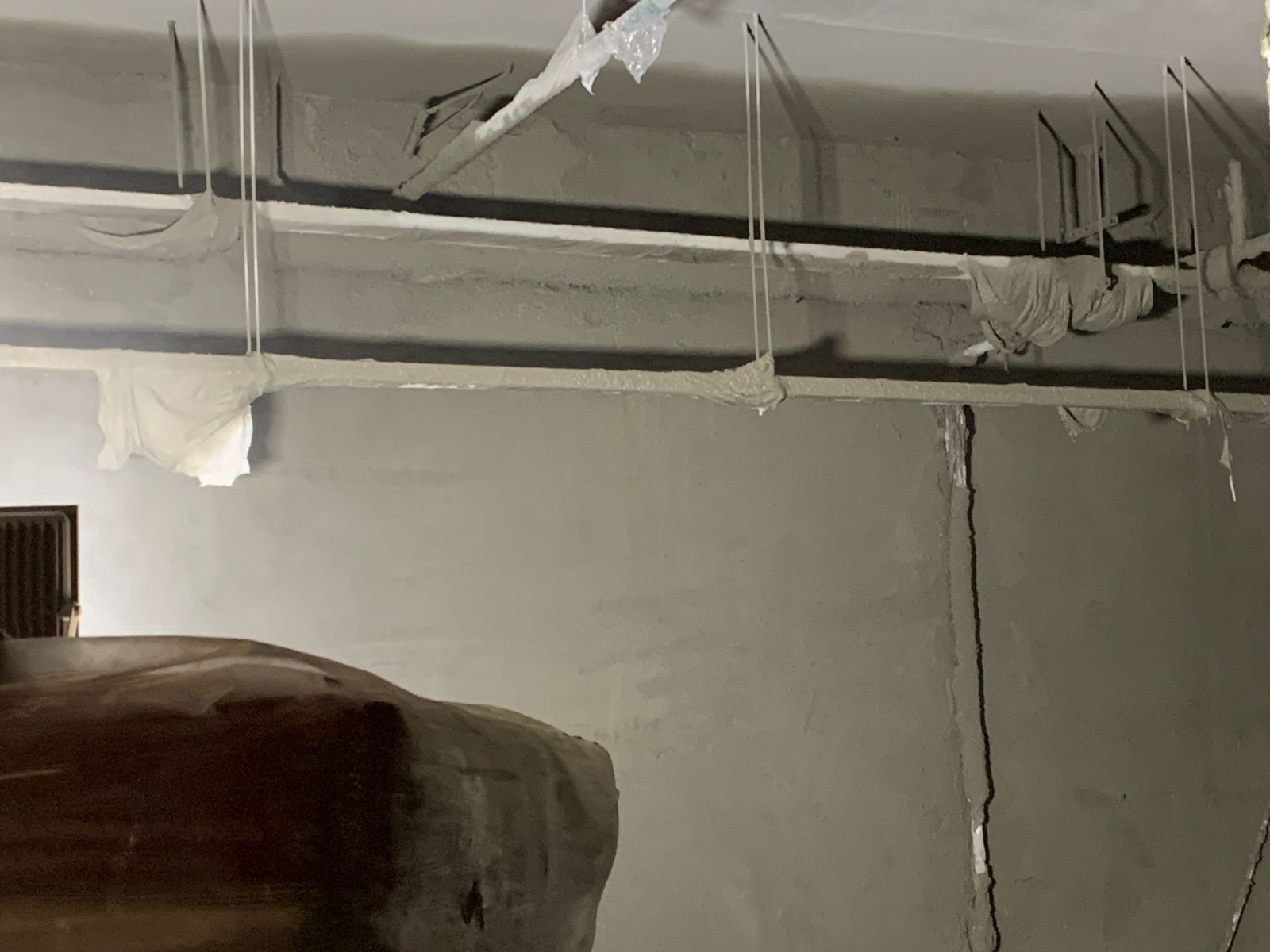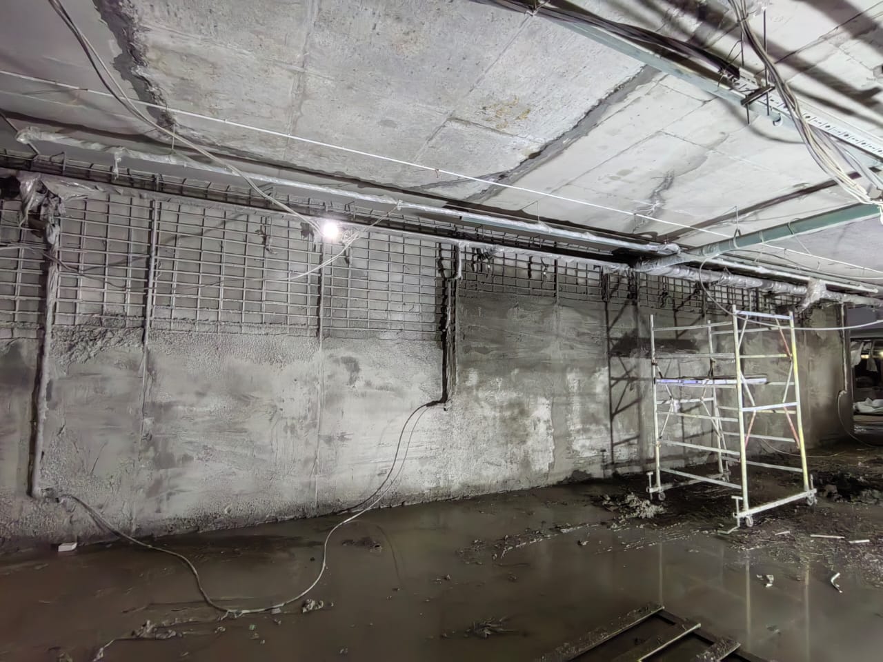 Выполненная работа: Монтаж железных обойм пилонов, установка вертикальных уголков, раскройка металла. Усиление плиты перекрытия углеволокном с последующем нанесение огнезащитного покрытия. ⁠Усиление пилонов металлическими обоймами. ⁠Усиление стен при помощи увеличения торкретирования.
